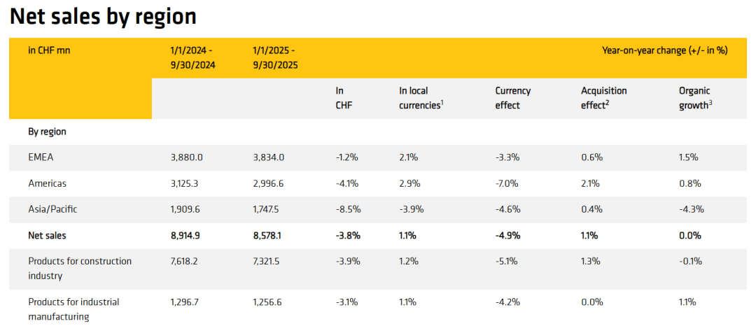 2025年前三季度,西卡集团在复杂市场环境中交出稳健答卷。在本地货币计价下,集团销售额同比增长1.1%;若剔除中国建筑业务影响,本地货币销售额增幅可达3%。受美元走弱等因素影响,外币对业绩产生 -4.9% 的冲击,以瑞士法郎计价的销售额为 85.78 亿瑞郎(约合人民币767.7亿元),同比下降3.8%。
