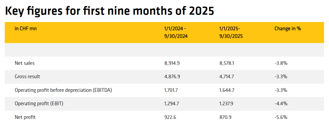 受外币因素显著影响,前三季度 EBITDA为16.45亿瑞郎,较去年同期的17.02亿瑞郎略有下降;净利润为8.71亿瑞郎,同比下降5.6%。