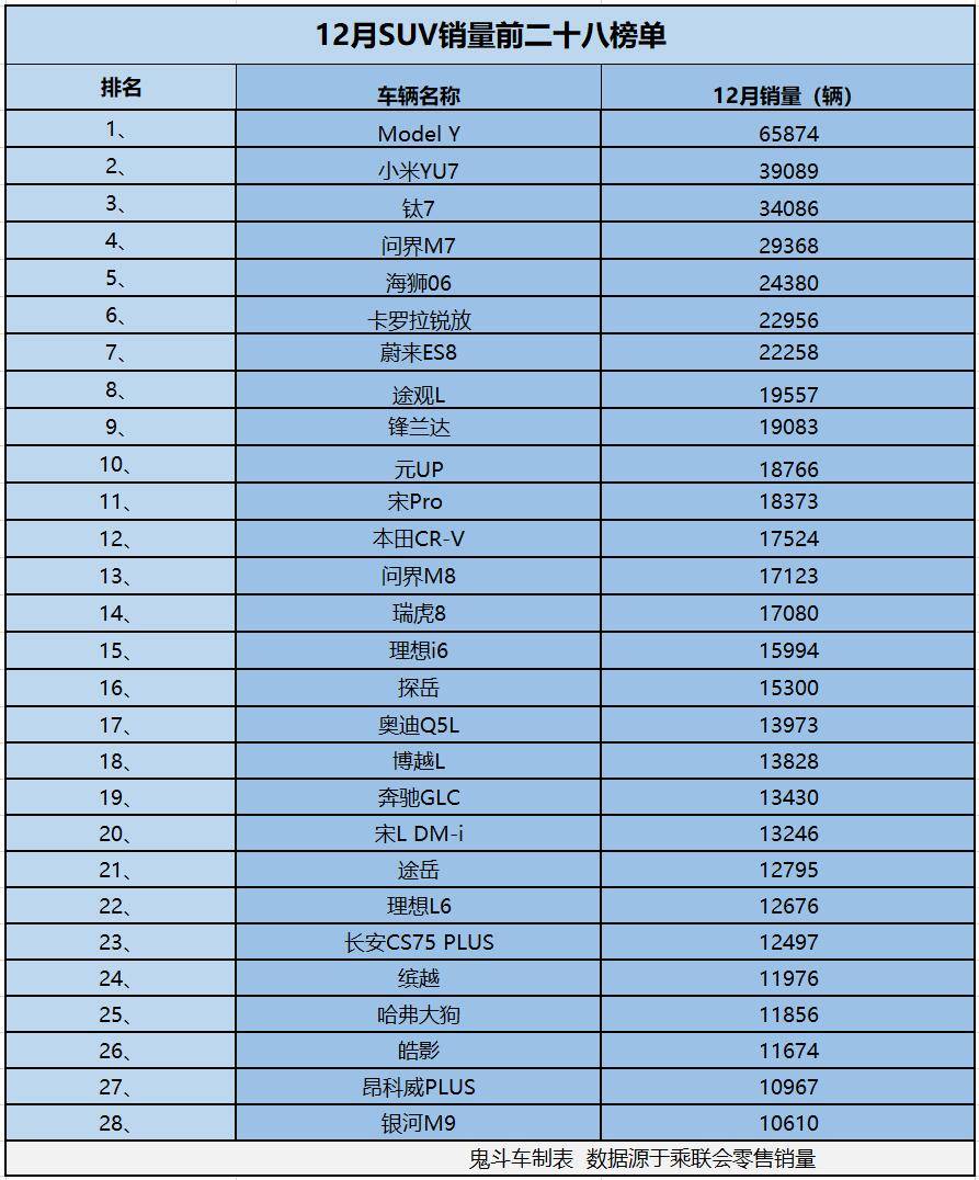 SUV卖得火!2025年12月销量南宫28官网- 南宫28官方网站- APP下载榜 款销量过万 钛7第三