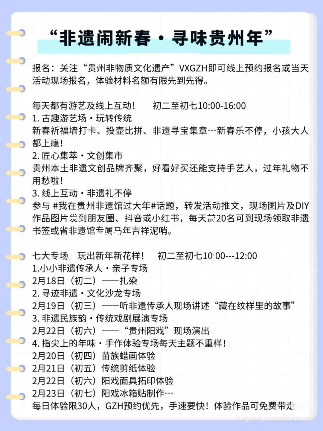 2月19日-2月21日(初三至初五:11:00-20:00)举办非遗集市,开展蜡染、水书、苗绣、剪纸、傩面、拓印等现场互动活动。(需购票)