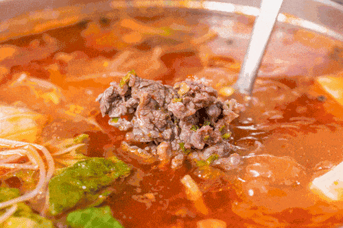 酸是贵州人饭桌上用来调味的重要调料,至今当地仍流传着“三天不吃酸,走路打窜窜”的古话。酸汤牛肉的出现,为贵阳人的“酸汤”味蕾打开了新世界。鲜切一份高山牛肉摆好盘,倒入滚开的酸汤锅底,一分钟不到夹起来,薄且大片的牛肉吸满酸汤,入口舌尖先尝到酸味,随着牙齿的咀嚼,牛肉的味道随之而来。