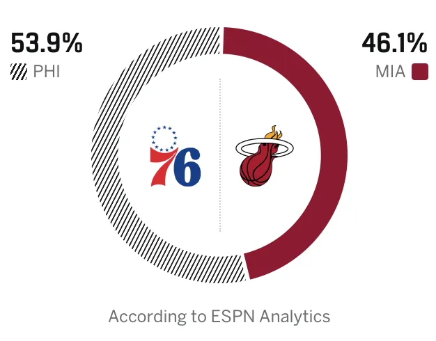 赛前,美媒ESPN预测本场比赛,76人胜率为53.9%,热火胜率为46.1%。