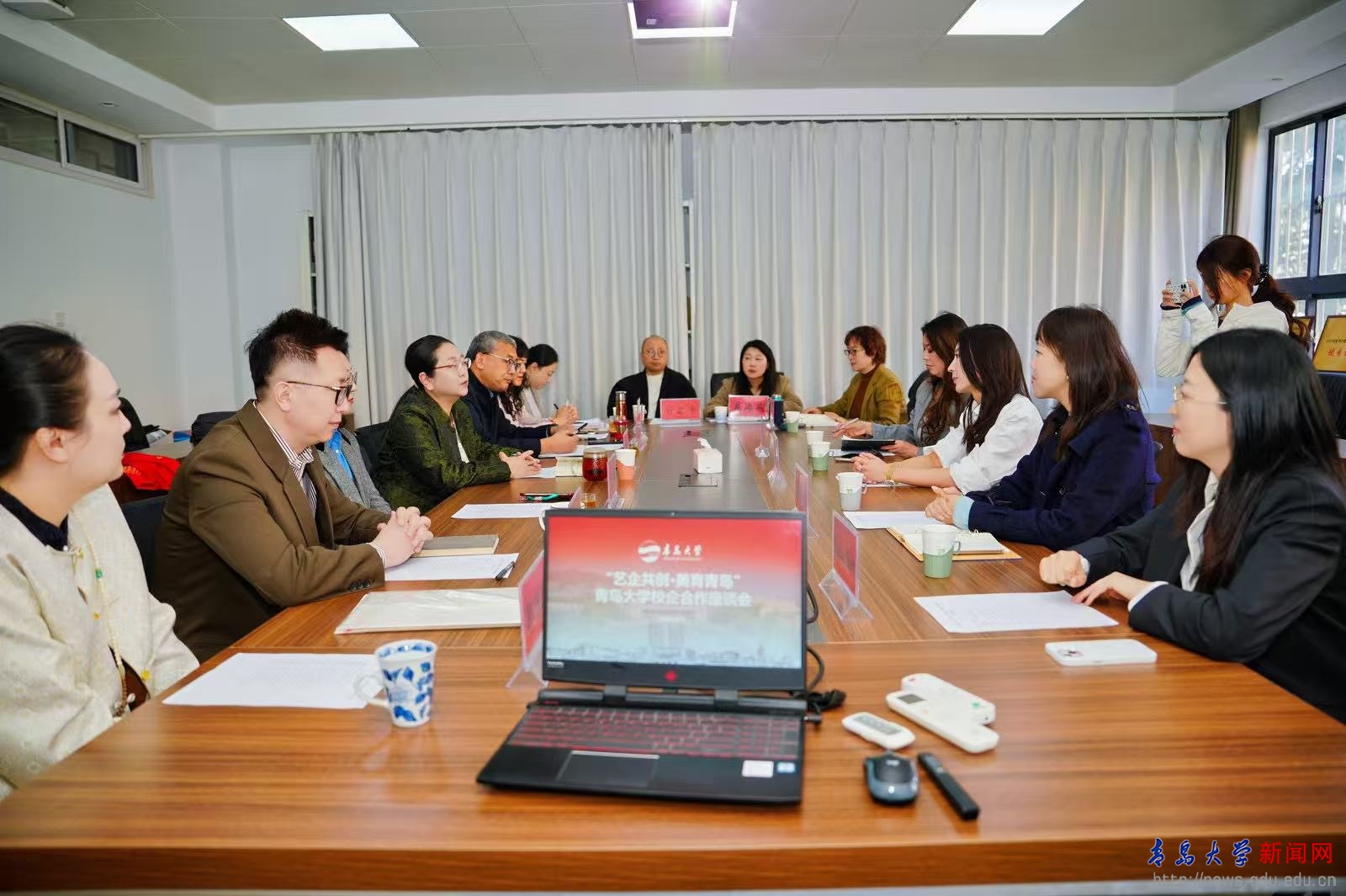 艺术学院院长王静怡代表学院向JINDING集团孙琳映董事长一行表示诚挚欢迎,并简要介绍了学院基本情况。王静怡表示,近年来,学院深耕艺术教育教学,致力于培养兼具专业素养、国际视野和家国情怀的高素质复合型艺术人才,人才培养质量不断提高,在国家级竞赛和艺术展演中屡获佳绩。学院充分发挥学科优势和特色,积极拓展社会服务,承接了上合示范区“上合之贝”场馆、胶东国际机场贵宾厅等重大艺术设计和展陈项目,与中国黄金、青岛地铁等企业联手进行产品设计和文创产品开发,与胶南大场镇、即墨古城共建实践基地,让艺术赋能乡村振兴和城市更新。学院打造形成了新年音乐会、舞蹈专场汇报演出、美术毕业作品展、原创歌剧等艺术活动品牌以及“美润昆仑”实践育人品牌,学院知名度和美誉度不断提升。